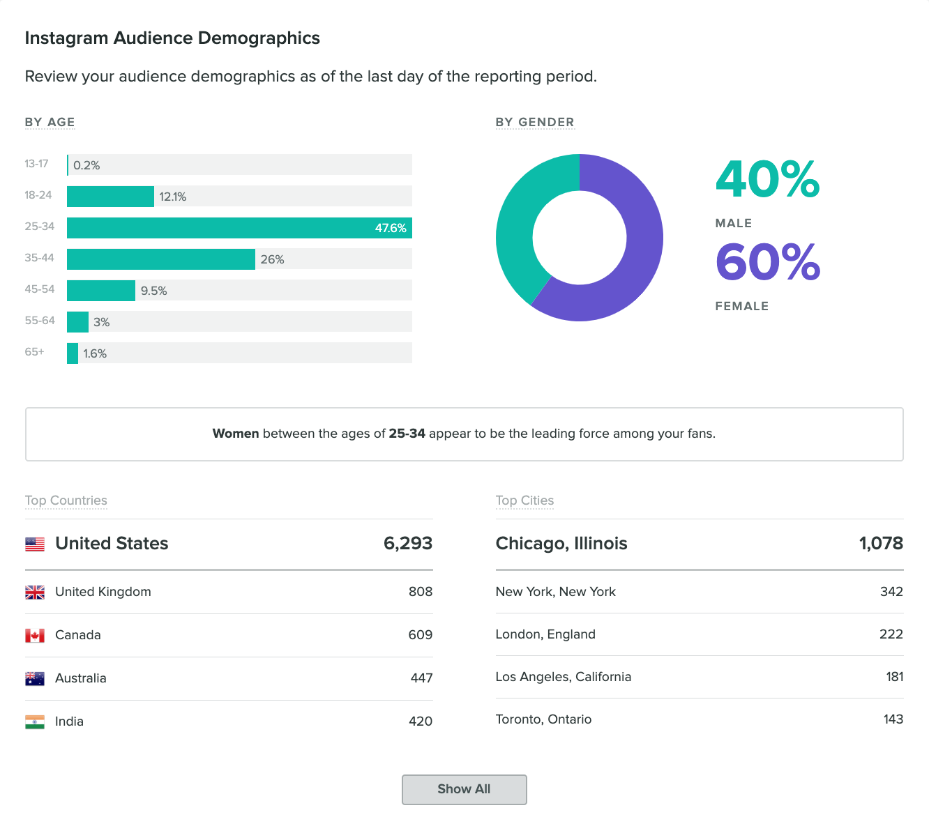 - ดูการวิเคราะห์ Instagram ของคุณ หากคุณใช้ Instagram สำหรับธุรกิจอยู่แล้ว ให้ไปที่การวิเคราะห์ของคุณและดูที่ข้อมูลประชากรของผู้ชม นี่จะแสดงให้คุณเห็นว่ามีคนประเภทไหนที่ติดตามคุณและมีส่วนร่วมกับโพสต์ของคุณ คุณยังสามารถใช้เครื่องมือการรายงานของ Sprout Social เพื่อเจาะลึกข้อมูลผู้ชม Instagram ของคุณ