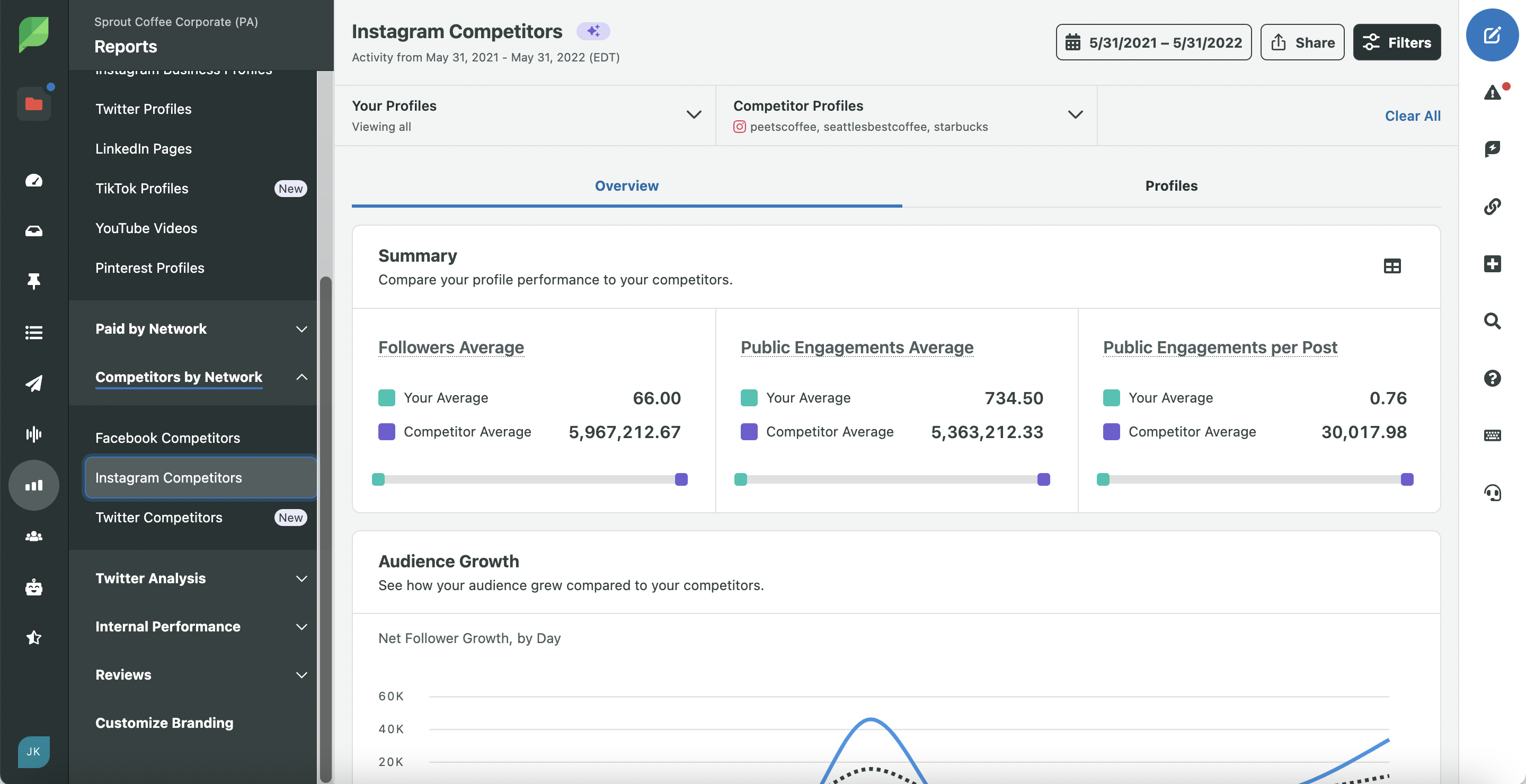 รายงานคู่แข่งบน Instagram ของ Sprout สามารถช่วยคุณรวบรวม แสดงภาพ และวิเคราะห์ข้อมูลนี้จากแดชบอร์ดเดียว