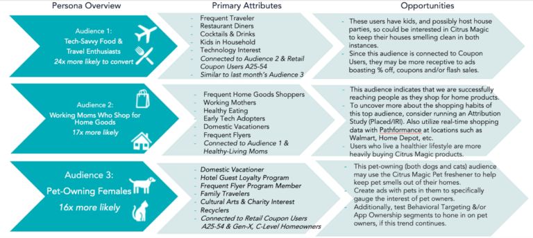 เราทำการเจาะลึกเพื่อสำรวจคุณลักษณะหลักของทั้งสามบุคคลเพื่อระบุโอกาสในการเปิดเผยลูกค้าต่อกลุ่มหลักเหล่านี้ในลักษณะที่สอดคล้องกับพวกเขา