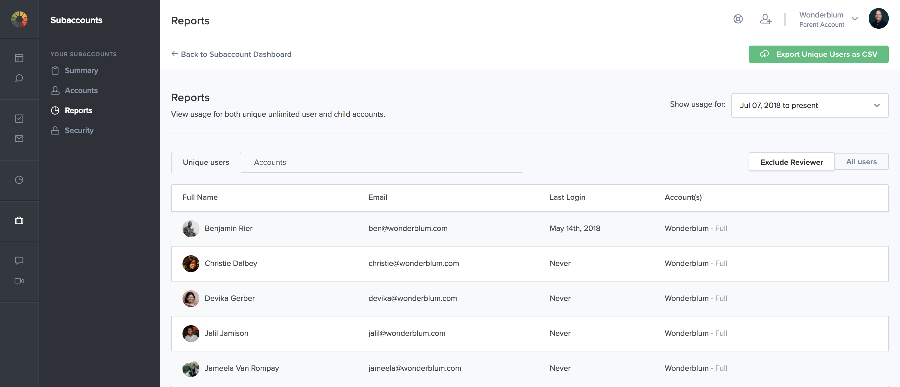 บัญชีย่อยยังมีฟีเจอร์การรายงานและความปลอดภัยในเชิงลึกอีกด้วย เจ้าของบัญชีสามารถตรวจสอบได้ว่าใครสามารถเข้าถึงอะไร เข้าสู่ระบบครั้งล่าสุดเมื่อใด และข้อมูลการใช้งานตามแต่ละบัญชีย่อย ส่งออกรายงานเป็น CSV ได้ ช่วยให้คุณระบุข้อมูลการใช้สารสีน้ำเงินโดยละเอียดเมื่อหมดเวลาตรวจสอบ