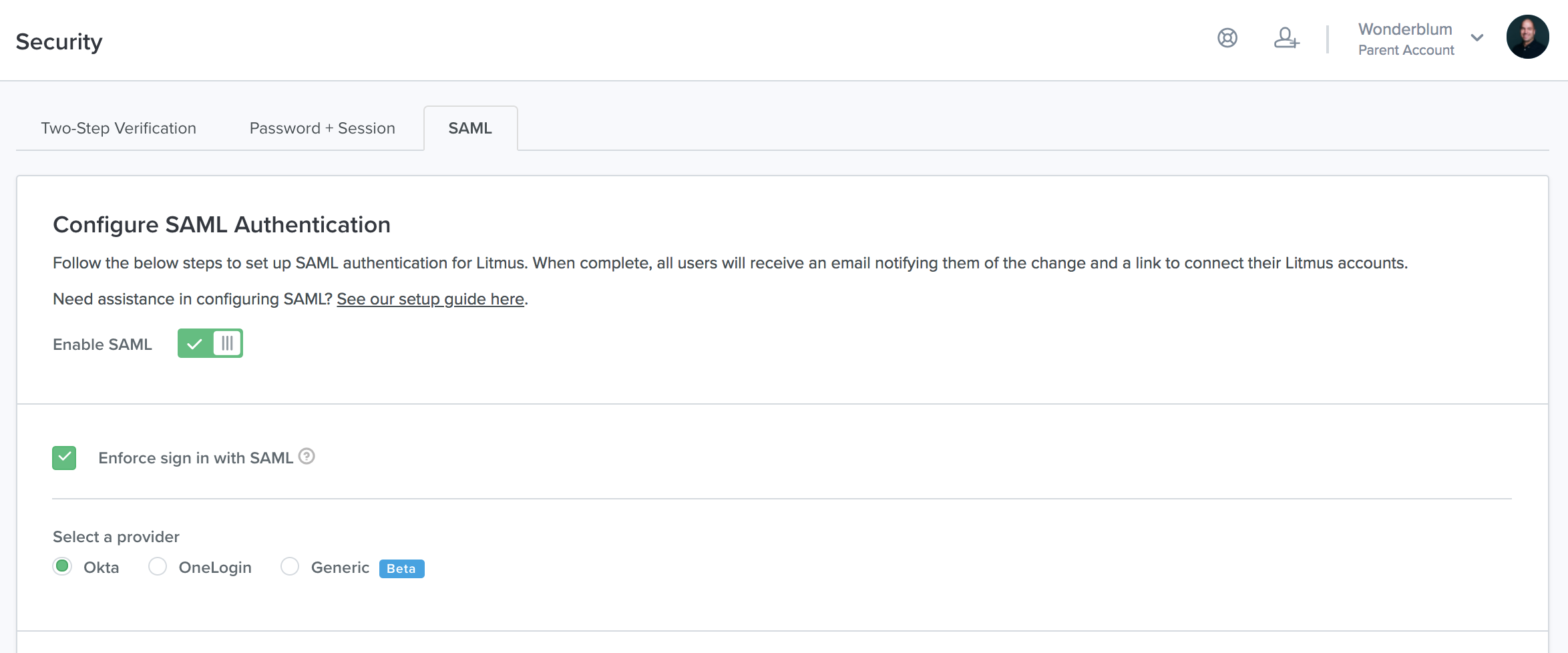 สุดท้าย คุณสามารถอนุญาตให้ผู้ใช้ลงชื่อเข้าใช้ Litmus โดยใช้การลงชื่อเพียงครั้งเดียวด้วย SAML แทนที่จะป้อนรหัสผ่านทุกครั้งที่ผู้ใช้เข้าสู่ระบบ Litmus SAML อนุญาตให้คุณใช้ผู้ให้บริการตรวจสอบสิทธิ์ด้วยข้อมูลประจำตัวชุดเดียวแทน ปัจจุบัน Litmus รองรับ Okta, OneLogin และผู้ให้บริการข้อมูลประจำตัวที่กำหนดเอง
