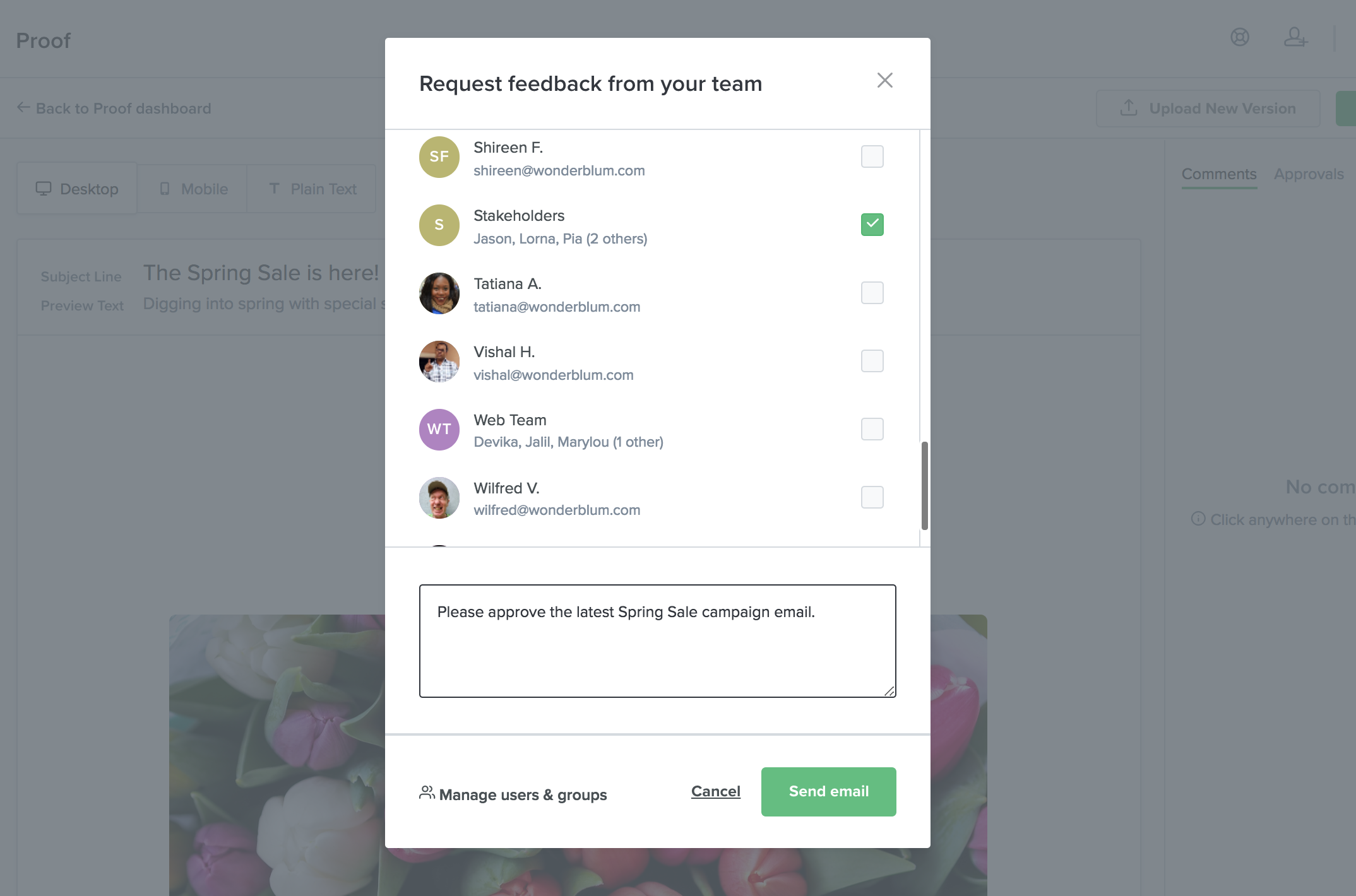 หากคุณต้องการให้ทีม QA ของคุณตรวจสอบอีเมลแต่ละฉบับ ให้ตั้งกลุ่ม “ทีม QA” และตรวจสอบในหน้าจอขอคำติชม ต้องการการลงชื่อออกจากผู้มีส่วนได้ส่วนเสียประจำของคุณหรือไม่? เพิ่มพวกเขาในกลุ่ม "ผู้มีส่วนได้ส่วนเสีย" และส่งการแจ้งเตือนทั้งหมดในครั้งเดียวแทนที่จะส่งอีเมลถึงแต่ละคนทีละคน