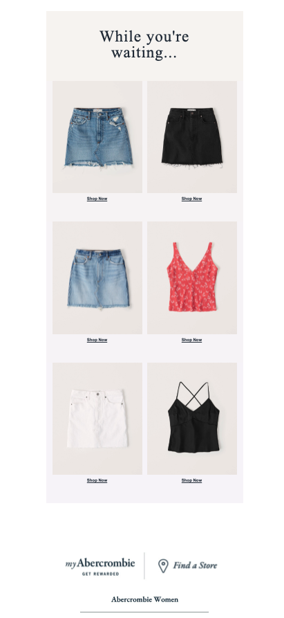 ตัวอย่างเช่น หากร้านค้าของคุณขายรองเท้า คุณสามารถส่งข้อความที่ปรับแต่งตามประเภทของรองเท้าที่นักช้อปซื้อ: รองเท้าชุดสตรี รองเท้าเด็ก ฯลฯ ข้อความนี้เน้นที่ข้อมูลประชากรมากกว่าที่อ้างอิงจากผลิตภัณฑ์ รับเคล็ดลับที่นำไปใช้ได้จริงเพิ่มเติมเกี่ยวกับสิ่งที่ควรรวมไว้ในอีเมลหลังการซื้อเหล่านี้