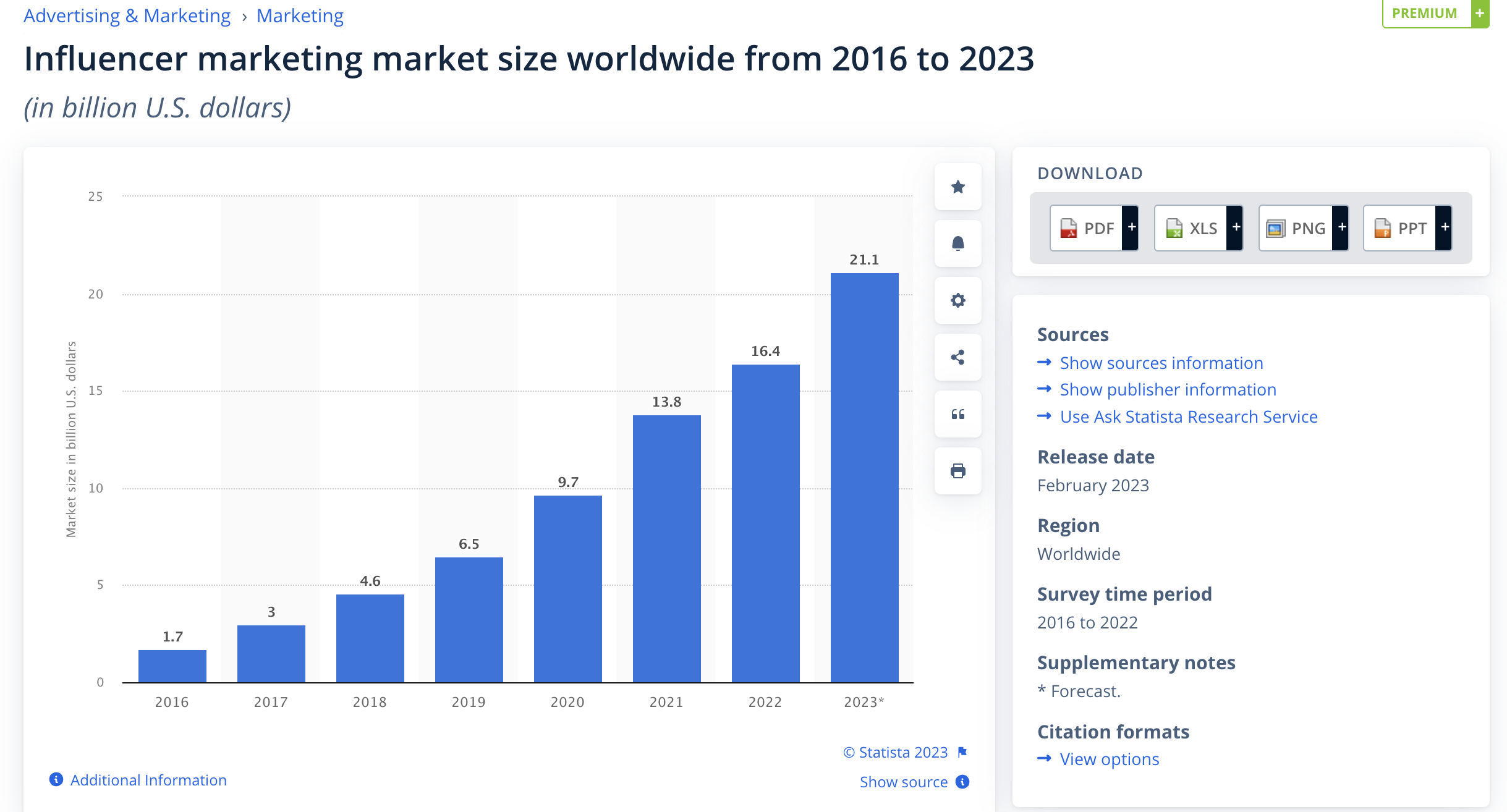 อุตสาหกรรมการตลาดโดยใช้อินฟลูเอนเซอร์มีมูลค่าเพียง 1.7 พันล้านดอลลาร์ในปี 2559 และมีมูลค่าถึง 16.4 พันล้านดอลลาร์ในปี 2565 และคาดว่าจะเพิ่มขึ้นอีก 5 พันล้านดอลลาร์ในปีนี้ การเติบโตแบบก้าวกระโดดนี้แสดงให้เห็นถึงความสมบูรณ์ของอุตสาหกรรมนี้