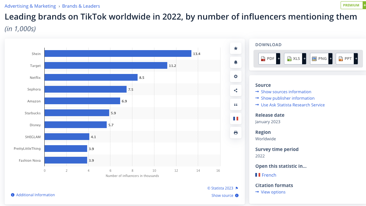 Shein ได้รับการกล่าวถึงโดยอินฟลูเอนเซอร์ TikTok 13,400 ราย เป้าหมายโดยอินฟลูเอนเซอร์ 11,200 ราย และ Netflix โดยอินฟลูเอนเซอร์ 8,500 ราย
