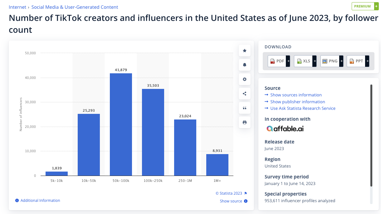 ณ เดือนมิถุนายน 2023 มีอินฟลูเอนเซอร์ของ TikTok มากกว่า 100,000 รายในสหรัฐอเมริกา โดยมีผู้ติดตามตั้งแต่ 5,000 คนไปจนถึง 1,000,000+ คน