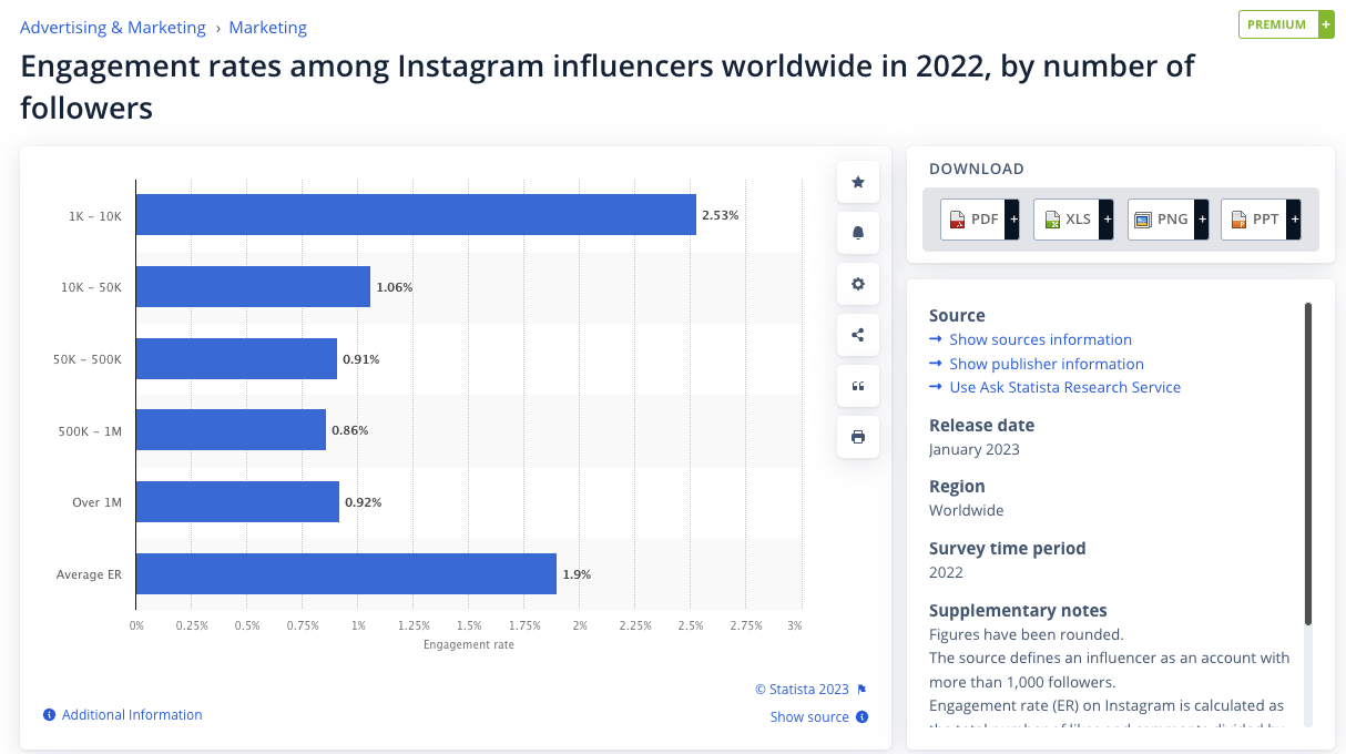 Nano-influencer หรือ Influencer ที่มีผู้ติดตามน้อยกว่า 10,000 คน มี Engagement Rate สูงสุดที่ 2.53% Micro-Influencer มีอัตราการมีส่วนร่วม 1.06%, Mid-Influencer อยู่ที่ 0.91%, Macro-Influencer 0.86% และ Mega-Influencer 0.92% อัตราการมีส่วนร่วมโดยเฉลี่ยของผู้มีอิทธิพลบน Instagram คือ 1.9%