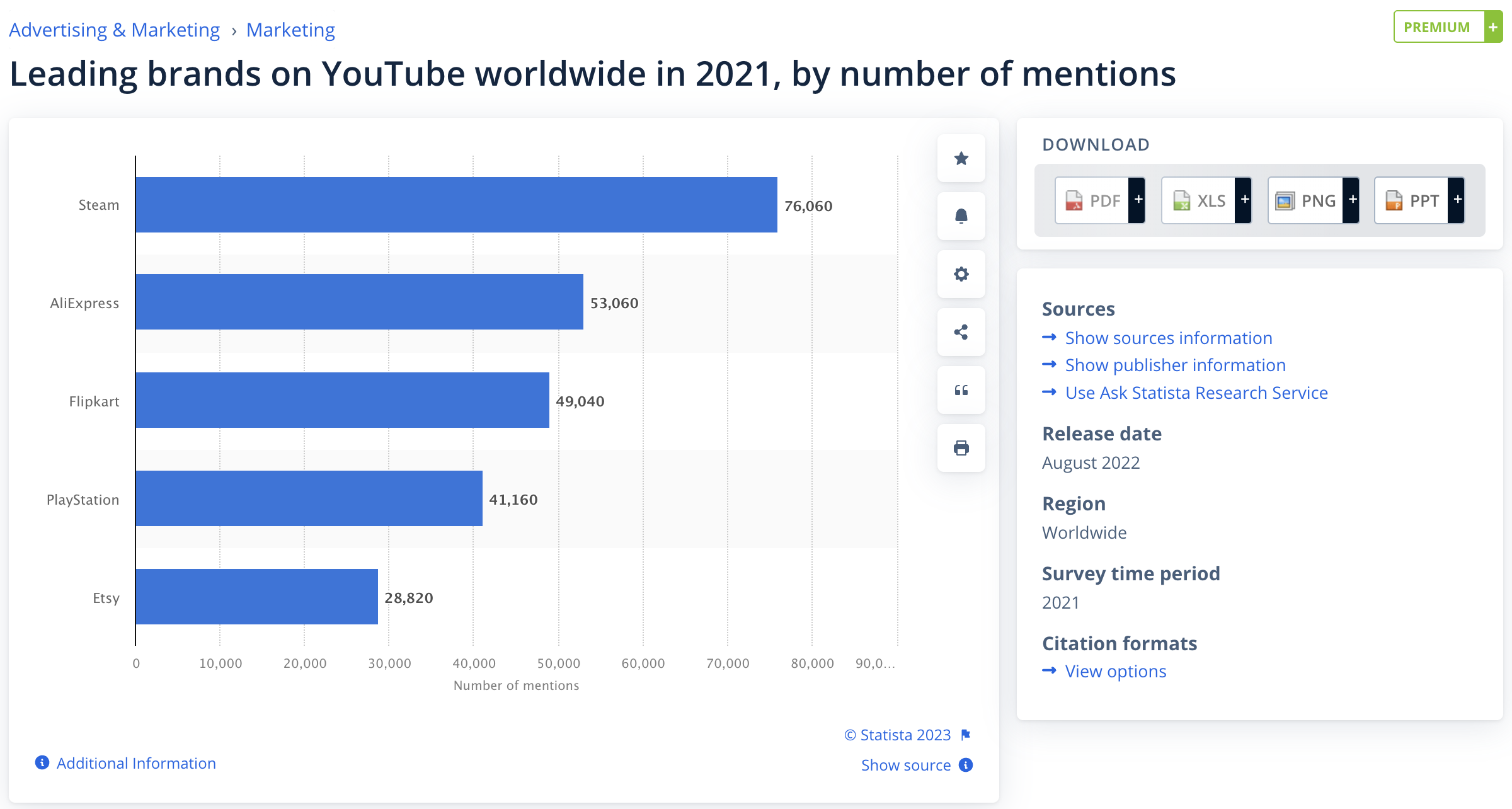 Steam ได้รับการกล่าวถึงบน YouTube 76,060 ครั้ง AliExpress ได้รับการกล่าวถึง 53,060 ครั้ง และ Flipkart ได้รับการกล่าวถึง 49,040 ครั้ง