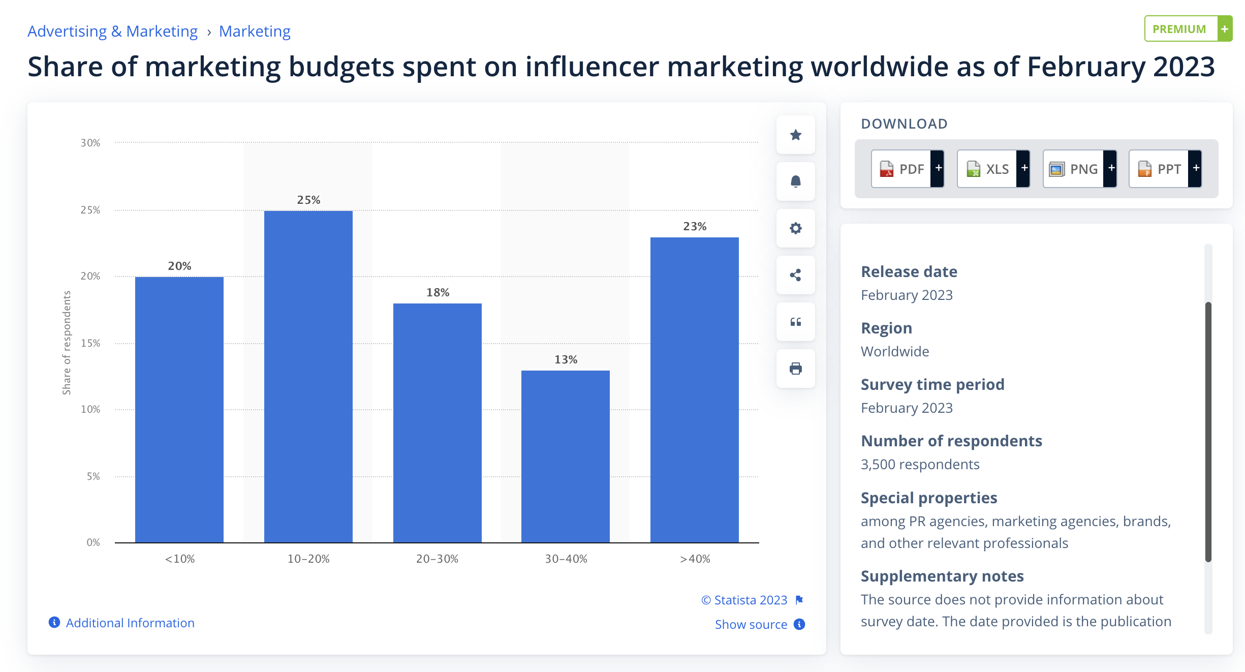 20% ของแบรนด์ทุ่มงบการตลาดน้อยกว่า 10% ไปกับการทำงานร่วมกับอินฟลูเอนเซอร์, 25% ของแบรนด์ทุ่ม 10-20% ไปหาอินฟลูเอนเซอร์, 18% ของแบรนด์ทุ่มงบ 20-30% ให้กับการตลาดอินฟลูเอนเซอร์, 13% ให้ 30% -40% ของงบประมาณและ 23% ของแบรนด์เน้นงบประมาณการตลาด 40% ขึ้นไปไปที่การทำการตลาดด้วยอินฟลูเอนเซอร์