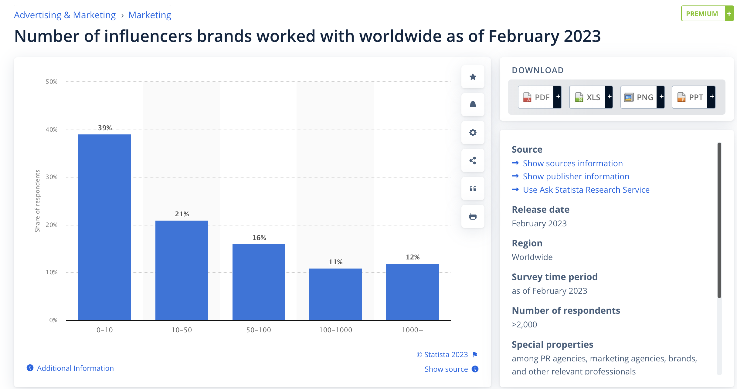 39% ของแบรนด์ทำงานร่วมกับผู้มีอิทธิพล 10 คนหรือน้อยกว่านั้น 21% ของแบรนด์ทำงานร่วมกับอินฟลูเอนเซอร์ 10-50 คน, 16% กับอินฟลูเอนเซอร์ 50-100 คน, 11% กับอินฟลูเอนเซอร์ 100-1,000 คน และ 12% กับอินฟลูเอนเซอร์มากกว่า 1,000 คน