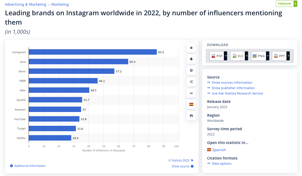 อินสตาแกรมได้รับการกล่าวถึงโดยอินฟลูเอนเซอร์บน Instagram 85,500 ราย Zara ได้รับการกล่าวถึงโดยอินฟลูเอนเซอร์ 66,400 ราย และ Shein โดยอินฟลูเอนเซอร์ 57,200 ราย