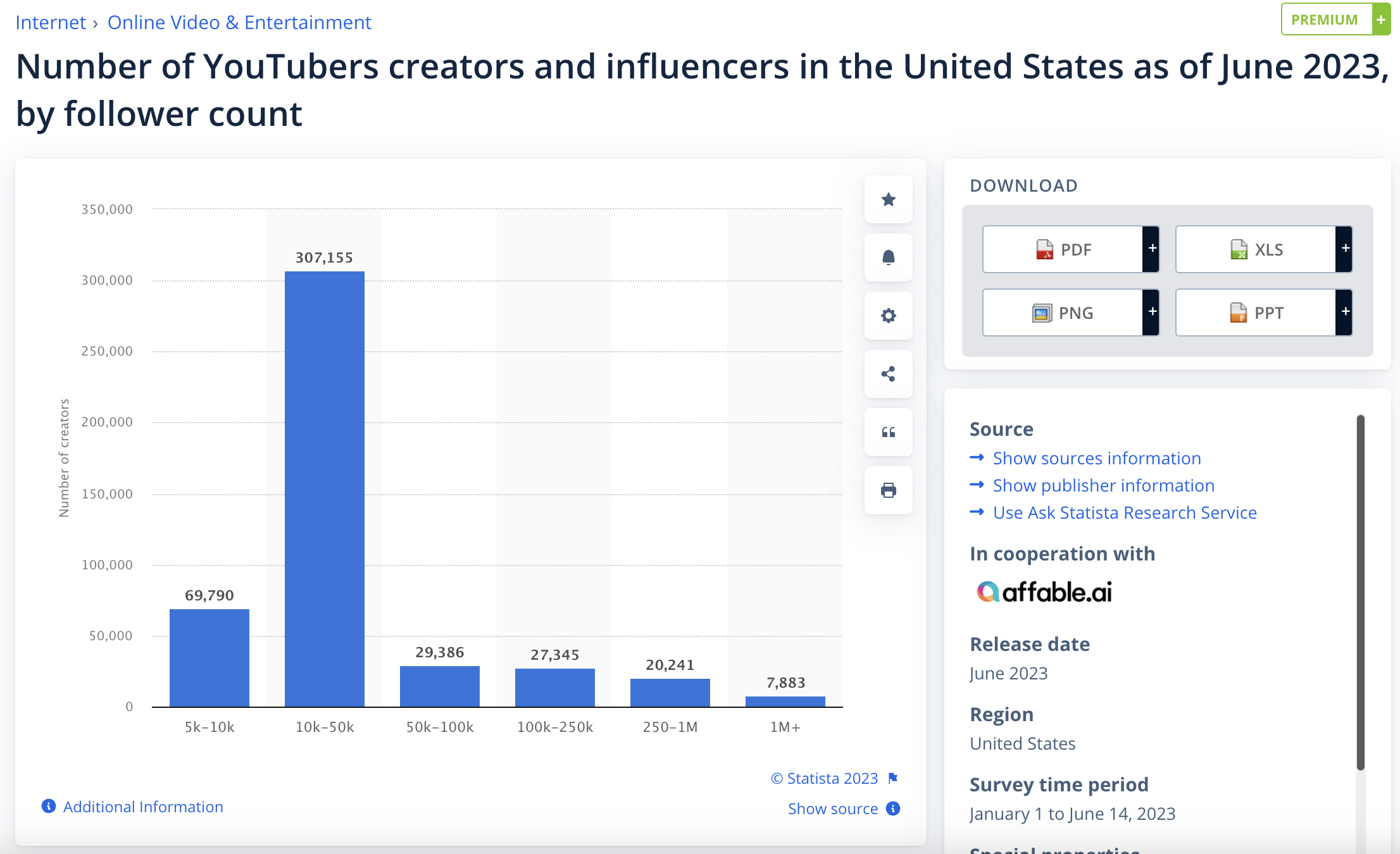 อินฟลูเอนเซอร์บน YouTube เกือบ 70,000 คนมีสมาชิก 5,000-10,000 คน มากกว่า 300,000 คนมีสมาชิก 10,000-50,000 คน เกือบ 30,000 คนมีสมาชิก 50,000-100,000 คน 27,000 คนมี 100,000-250,000 คน 20,000 คนมี 250,000-1 ,000,000 และเกือบ 8,000 มีผู้ติดตามมากกว่า 1 ล้านคน