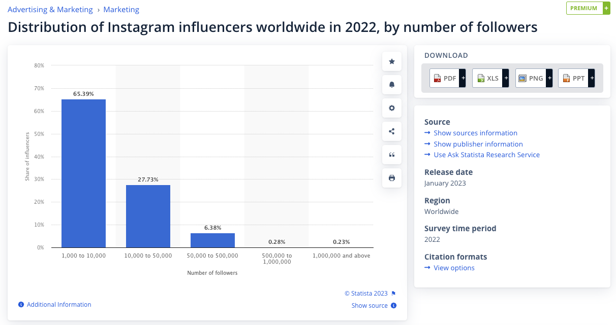 อินฟลูเอนเซอร์บน Instagram ส่วนใหญ่เป็นนาโนอินฟลูเอนเซอร์ โดยมีผู้ติดตามน้อยกว่า 10,000 คน 27.73% ของผู้มีอิทธิพลบน Instagram มีผู้ติดตามระหว่าง 10,000 ถึง 50,000 คน, 6.38% มีผู้ติดตาม 50,000 ถึง 500,000 คน, เพียง 0.28% มีผู้ติดตามระหว่าง 500,000 ถึง 1,000,000 คน และเพียง 0.23% เท่านั้นที่มีผู้ติดตามมากกว่า 1 ล้านคน