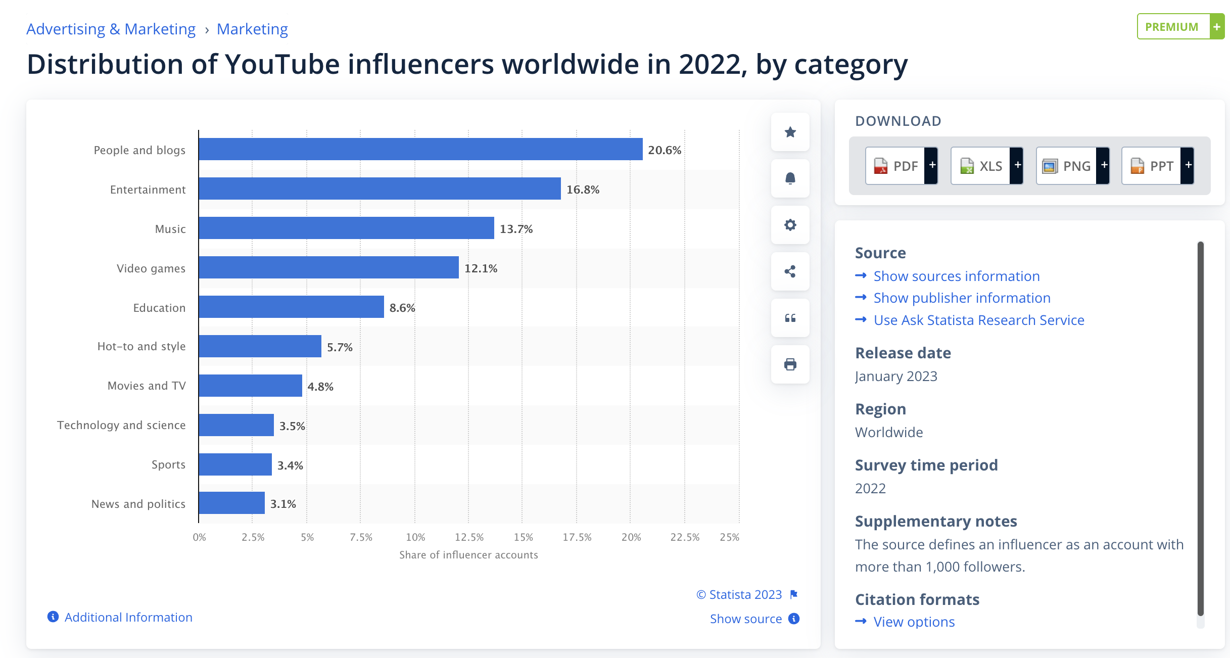 หมวดหมู่ผู้มีอิทธิพลบน YouTube ที่ใหญ่ที่สุด (20.6% ของผู้มีอิทธิพล) มุ่งเน้นไปที่เนื้อหาที่อยู่รอบ ๆ ผู้คนและบล็อก ตามมาด้วยอินฟลูเอนเซอร์ด้านความบันเทิง (16.8%) อินฟลูเอนเซอร์ด้านดนตรี (13.7%) และผู้มีอิทธิพลด้านวิดีโอเกม (12.1%)