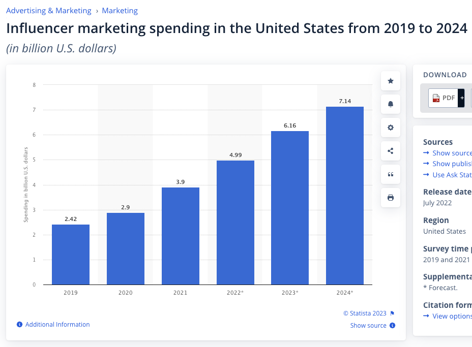 เพิ่มขึ้นจาก 2.42 พันล้านดอลลาร์ในปี 2562 ปัจจุบันแบรนด์ต่างๆ คาดว่าจะใช้จ่ายรวม 7.14 พันล้านดอลลาร์สำหรับการตลาดแบบใช้อินฟลูเอนเซอร์ในปี 2567