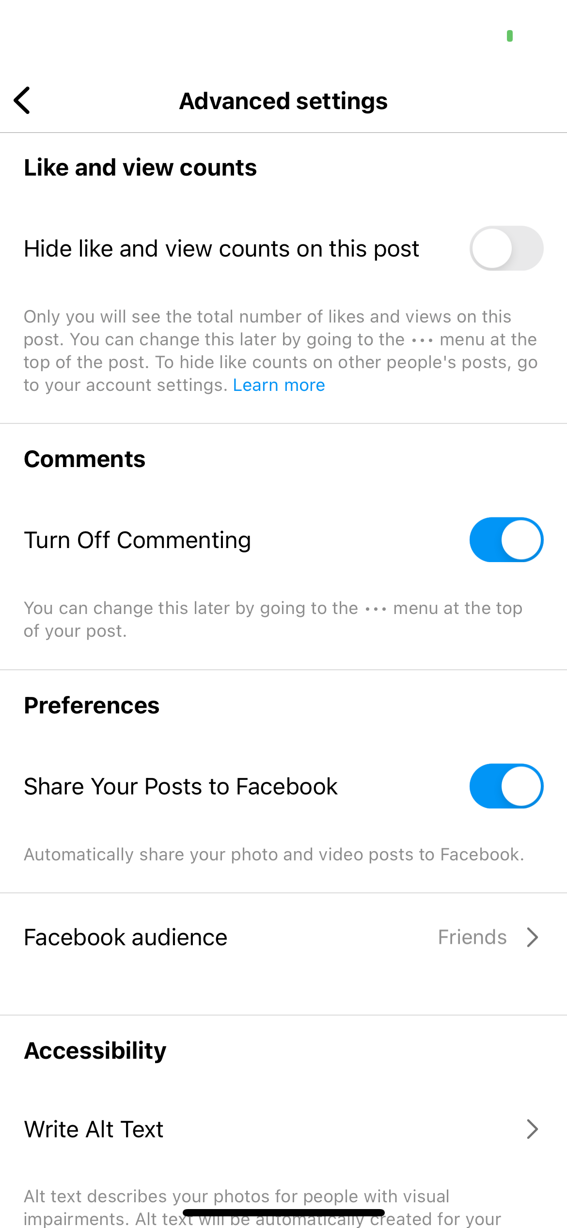 เมื่อคุณสร้างโพสต์ใหม่และไปที่หน้าที่คุณเพิ่มคำบรรยาย ให้แตะ การตั้งค่าขั้นสูง ที่ด้านล่างของหน้าจอ จากนั้นสลับตัวเลือก ปิดการแสดงความคิดเห็น