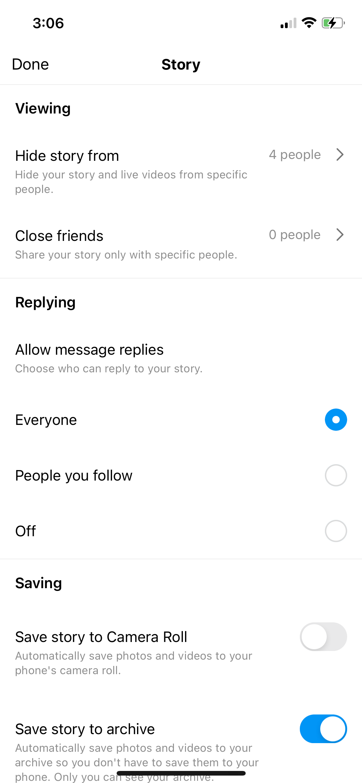 เมื่อคุณสร้างเรื่องราวใหม่ ให้เปิดมันขึ้นมา จากนั้นแตะจุดสามจุดที่มุมขวาล่างที่มีข้อความว่า เพิ่มเติม แตะ การตั้งค่าเรื่องราว จากนั้น ซ่อนเรื่องราวจาก ซึ่งจะทำให้คุณสามารถเลือกบัญชีที่ต้องการเพื่อซ่อนเรื่องราวทั้งหมดของคุณได้ คุณสามารถรีเซ็ตสิ่งนี้เพื่อลบบัญชีออกจากรายการนี้เมื่อเรื่องราวที่คุณซ่อนไว้หมดอายุ