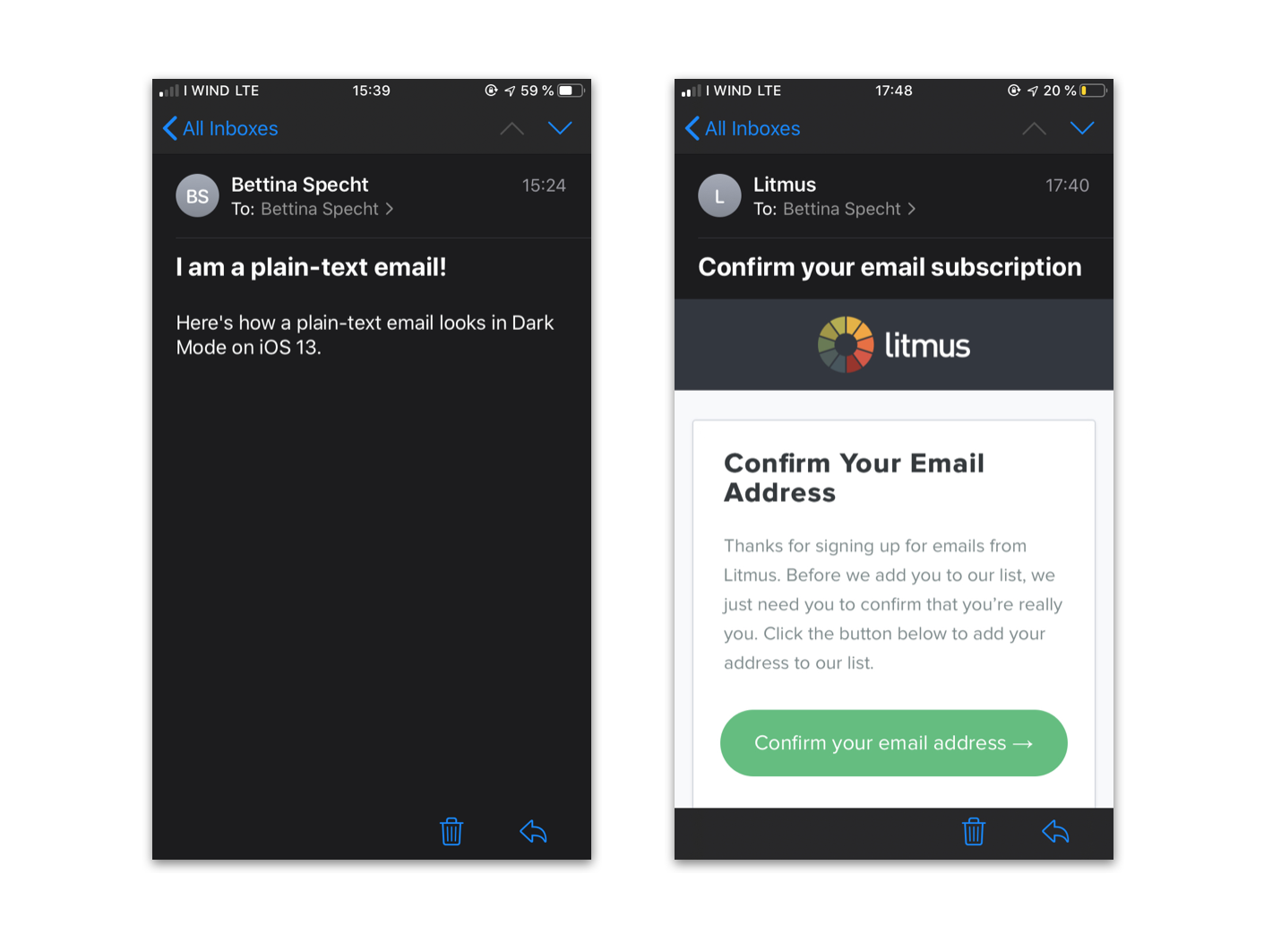 อย่างไรก็ตาม ใน iOS 13 นักพัฒนาอีเมลสามารถกำหนดเป้าหมายโหมดมืด และมอบประสบการณ์ที่กำหนดเองสำหรับสมาชิกที่เปิดในโหมดมืด