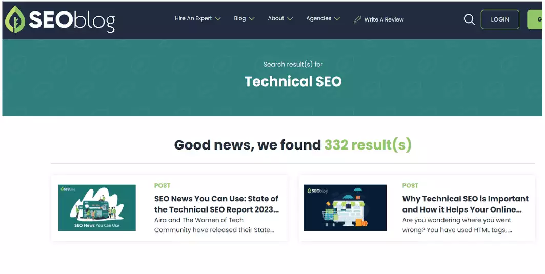ตัวอย่างเช่น เมื่อฉันป้อนข้อความค้นหา “Technical SEO” ลงในแถบค้นหาของ SEOblog ฉันได้รับผลลัพธ์ 332 รายการ