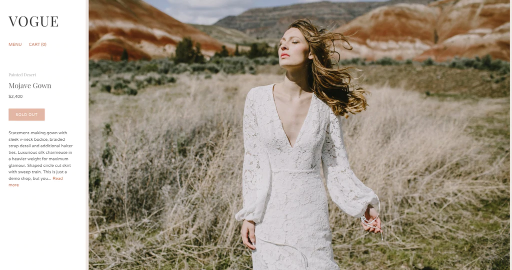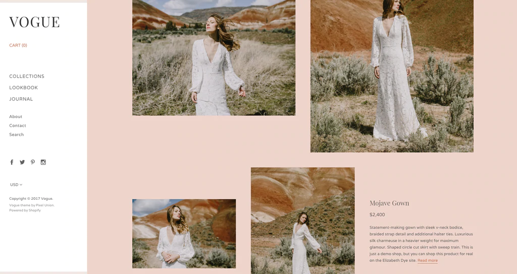 Vogue เป็นธีมแรกของ Shopify ที่มีเทมเพลต Lookbook ในตัว ซึ่งจะแสดงสินค้าจากคอลเลกชั่นของคุณในตารางสไตล์บรรณาธิการที่น่าดึงดูดใจ เมื่อคุณใช้เทมเพลตกับหน้า ธีมจะดึงรูปภาพจากหน้าผลิตภัณฑ์ของคุณโดยอัตโนมัติเพื่อสร้างลุคบุ๊กที่ลูกค้าสามารถเรียกดูได้ในลักษณะเดียวกับที่พวกเขาอาจพลิกดูนิตยสารแฟชั่นหรือการใช้ชีวิตที่บ้าน
