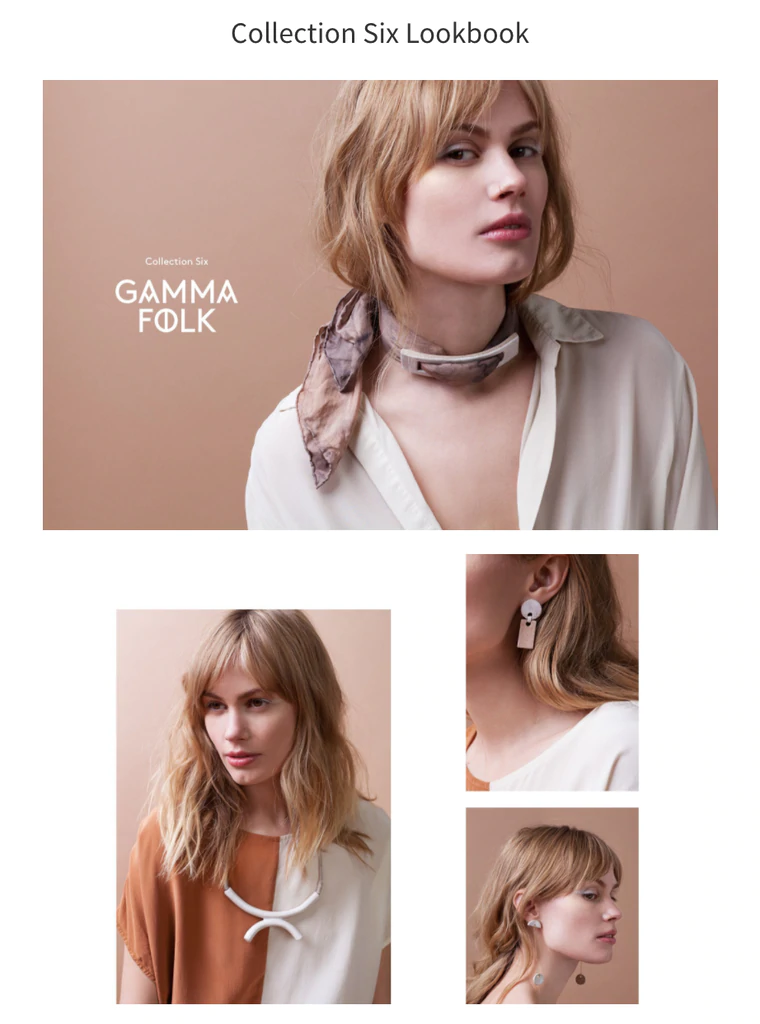 ใช้ Gamma Folk ซึ่งใช้ธีมแปซิฟิก พวกเขาได้จัดเรียงรูปภาพหลายภาพในไฟล์ภาพเดียว โดยใช้พื้นที่ว่างเพื่อเลียนแบบการจัดวางตารางที่น่าสนใจยิ่งขึ้น รูปภาพที่แก้ไขเหล่านี้จะถูกนำเสนอบนหน้าแบบกำหนดเองเป็นกองไฟล์รูปภาพอย่างง่าย และผลลัพธ์ที่ได้คือลุคบุ๊กที่ทันสมัยสำหรับเครื่องประดับและเครื่องประดับ