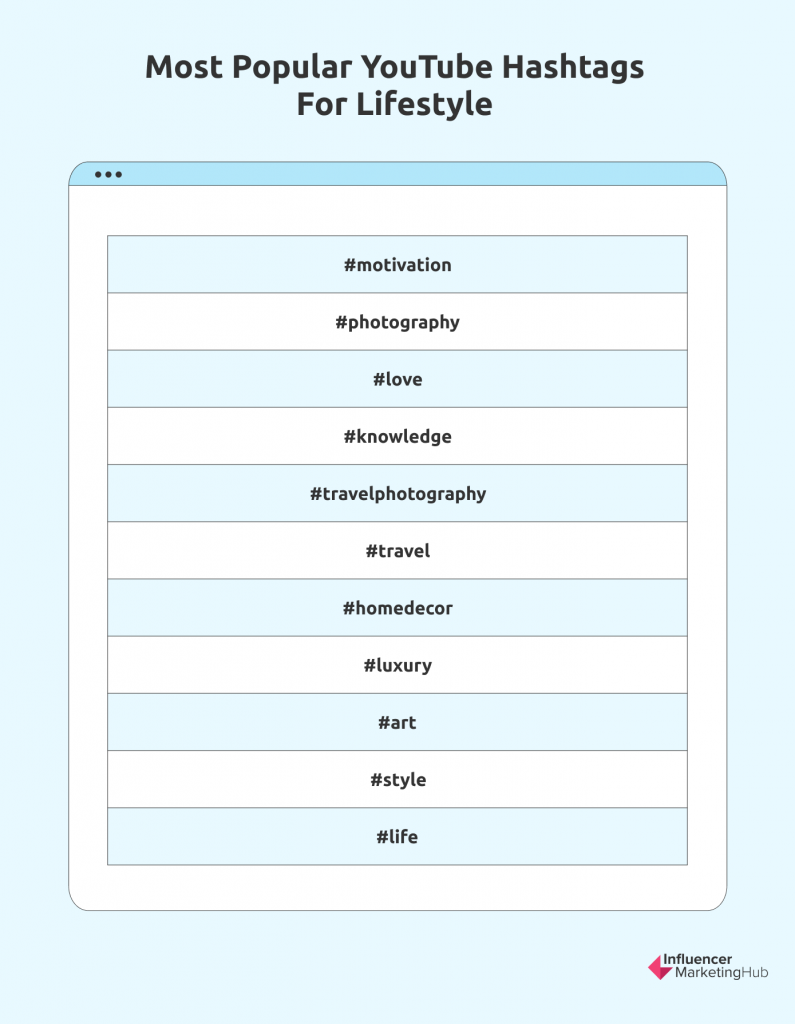 ไลฟ์สไตล์เป็นหนึ่งในโดเมนที่ผู้มีอิทธิพลของ YouTube สามารถช่วยส่งผลต่อการตัดสินใจของผู้บริโภคได้เป็นอย่างมาก เป็นการจัดประเภทที่ค่อนข้างกว้างและอาจรวมถึงหมวดหมู่อื่นๆ เช่น อาหาร ที่เราได้ระบุไว้แล้ว ไม่ว่าในกรณีใด หากคุณกำลังสร้างเนื้อหาโดยมีเป้าหมายเพื่อปรับปรุงคุณภาพชีวิตโดยรวมของผู้ดู ต่อไปนี้คือแฮชแท็กบางส่วนที่อาจเกี่ยวข้อง: