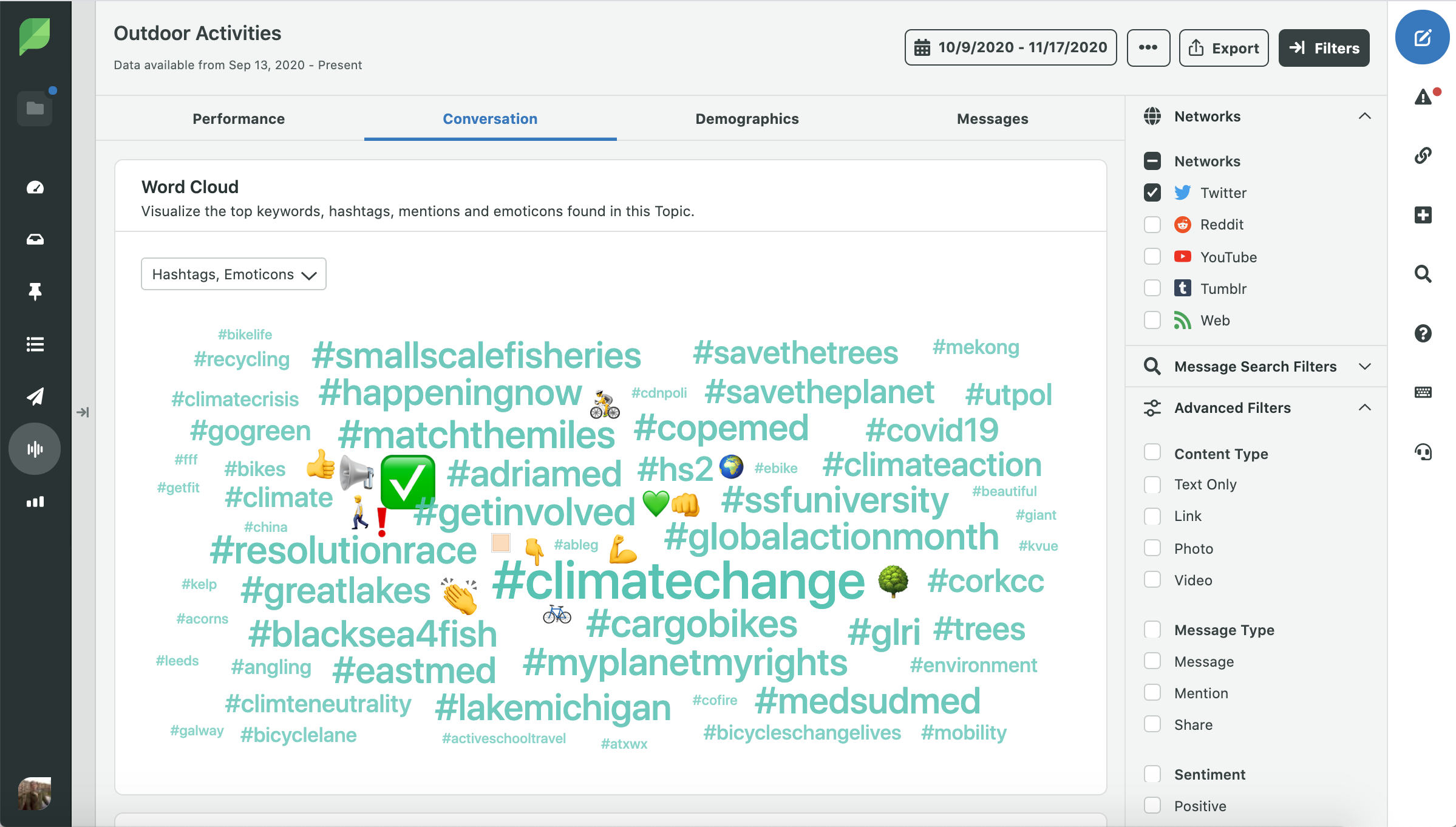 การใช้แพลตฟอร์ม Social Listening ของ Sprout เราได้รวบรวมข้อมูลเชิงลึกจากการสนทนาล่าสุดเกี่ยวกับกิจกรรมกลางแจ้งเพื่อเรียนรู้ว่ากิจกรรมใดที่ผู้คนมีส่วนร่วมมากที่สุด ความรู้สึกของพวกเขาเกี่ยวกับกิจกรรมเหล่านี้ และสิ่งที่แบรนด์กำลังทำเพื่อตอบโต้ เราวิเคราะห์ทวีตมากกว่า 103,200 ทวีตระหว่างวันที่ 10 ตุลาคมถึง 17 พฤศจิกายน และพบว่าการอยู่ข้างนอกนั้นกำลังเข้ามา