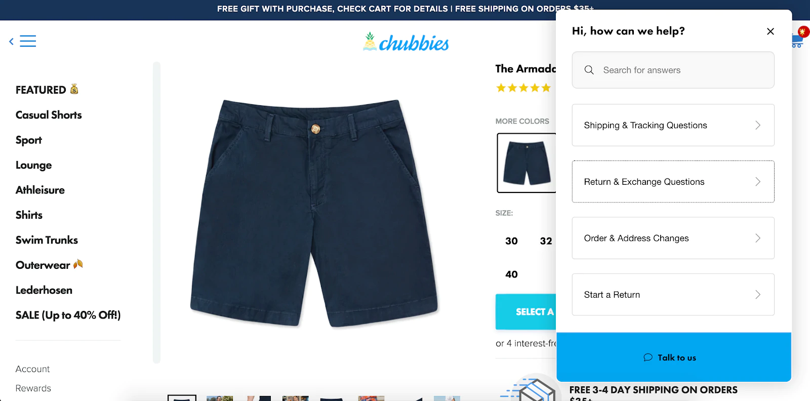 ตัวอย่างนโยบายคืนสินค้าที่ดีอย่างหนึ่งมาจาก Chubbies ผู้ค้าปลีกเสื้อผ้าออนไลน์ แบรนด์มีคำถามส่งคืนในหน้าต่างแชทของเว็บไซต์ คุณยังสามารถเริ่มต้นการคืนสินค้าได้ด้วยคลิกเดียว