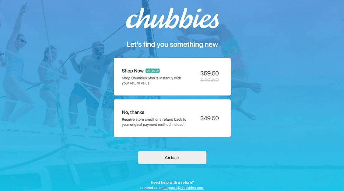 ด้วยการทำให้ตัวเลือกการแลกเปลี่ยนมีค่ามากขึ้นเท่านั้น และไม่ลงโทษลูกค้าที่ต้องการส่งคืน Chubbies จะสร้างประสบการณ์ที่ดีให้กับลูกค้าสำหรับทุกคน ในขณะเดียวกันก็กระตุ้นให้ลูกค้าเลือกการแลกเปลี่ยนแทนการคืนสินค้ามากขึ้น