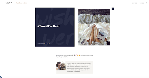 Loews Hotels ใช้ UGC และ EGC เพื่อแสดงแนวคิดใหม่สำหรับการเดินทาง: #TravelForReal Loews Hotel ใช้เนื้อหาที่ผู้ใช้และพนักงานสร้างขึ้นจาก Instagram แสดงให้ลูกค้าเห็นว่าไม่จำเป็นต้องมีแผนใหญ่ในการเดินทาง…เพียงแค่อ่านหนังสือบนเตียงพร้อมกาแฟสักแก้วถือเป็นการผจญภัยในการเดินทางในทุกวันนี้