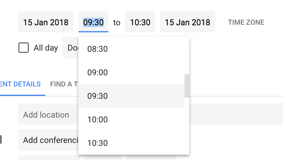 โดยปกติการประชุมจะกำหนดไว้เป็นช่วงครึ่งชั่วโมงหรือเป็นชั่วโมง ฉันคิดว่าเหตุผลใหญ่สำหรับเรื่องนี้ก็คือ แม้ว่าคุณสามารถเขียนทับได้ แต่ 30 นาทีเป็นการตั้งค่าเริ่มต้นใน Google ปฏิทิน