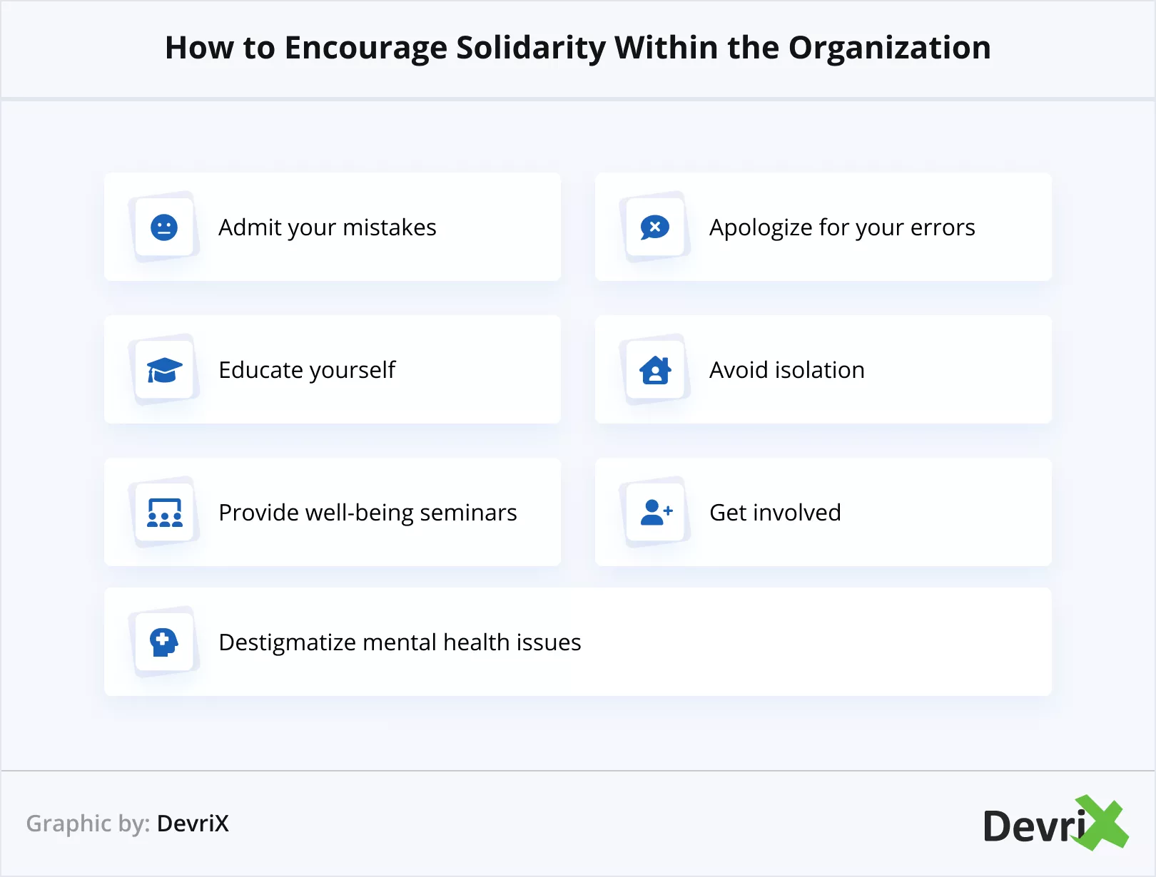 บ่อยครั้งที่พนักงานกลัวที่จะยอมรับว่าตนเองมีภาวะสุขภาพจิตที่แฝงอยู่ เพราะรู้สึกว่าตนอาจถูกตีตราและเลือกปฏิบัติ สิ่งนี้จะยากขึ้นสำหรับผู้ที่ยังใหม่ต่อความรู้สึกนี้ ดังนั้นโปรดแสดงให้สมาชิกในทีมเห็นว่าคุณห่วงใย