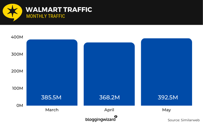 จากข้อมูลการเข้าชมที่รวบรวมโดย Sameweb ในช่วงระยะเวลาสามเดือน Walmart.com ได้รับการเข้าชมโดยเฉลี่ย 382.1 ล้านครั้งต่อเดือน