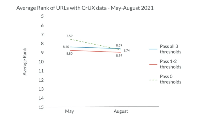 “Moz ในการศึกษาปัจจัยการจัดอันดับประสบการณ์หน้าเว็บล่าสุด ได้แสดงให้เห็นว่าการผ่านตัวชี้วัด Core Web Vitals ทั้งสามตัวไม่ได้เพิ่มความได้เปรียบที่มีนัยสำคัญเพียงพอในการส่งผ่านสองตัวชี้วัด” เขากล่าว การศึกษาโดย SISTRIX ยังพบว่าหน้าเว็บที่ตรงตามข้อกำหนด CWV ทั้งสามข้อมีอันดับที่ดีกว่าค่าเฉลี่ยสำหรับโดเมนทั้งหมดเพียง 1% แต่หน้าเว็บที่ไม่ผ่านตัวชี้วัด CWV อย่างน้อยหนึ่งตัวมีอันดับที่แย่กว่า 3.7% (ตามดัชนีการมองเห็นของ SISTRIX)
