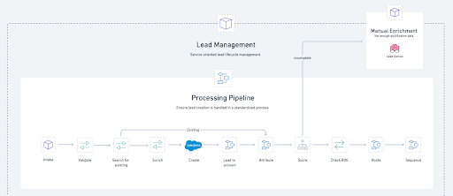 ที่ศูนย์กลางของเฟรมเวิร์กนี้คือเวิร์กโฟลว์ที่เราเรียกว่า "ไปป์ไลน์การประมวลผลลูกค้าเป้าหมาย" ไปป์ไลน์มีหน้าที่รับผิดชอบในการเตรียมงานการจัดการลูกค้าเป้าหมายที่จำเป็นแต่ละงานให้เสร็จ ตั้งแต่การบริโภคไปจนถึงการสร้างไปจนถึงการตกแต่งและอื่น ๆ คุณสามารถใช้กระบวนการนี้สำหรับลีดใดก็ได้ไม่ว่าจะมาจากแหล่งใด