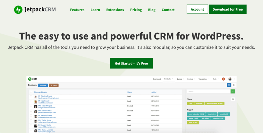 Jetpack CRM ให้ประโยชน์เช่นเดียวกับ UpiCRM เริ่มต้นด้วยมันฟรี แต่ยิ่งไปกว่านั้น มันง่ายมากและใช้งานง่ายมาก หากคุณกำลังมองหาวิธีแก้ปัญหาที่เบามาก อย่างน้อยก็ควรเริ่มด้วย Jetpack เป็นตัวเลือกที่ยอดเยี่ยม