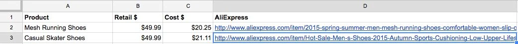 Bunu manuel olarak yapmak istiyorsanız, sitenizdeki tüm ürünlerin listesini, bunları sattığınız tutarı, AliExpress'te maliyetini ve bağlantısını içeren bir elektronik tabloya sahip olmak iyi bir fikir olabilir. AliExpress listesi. Bu şekilde, bir sipariş aldığınızda AliExpress'te tedarikçiyi bulmanız ve fiyat değişikliklerini takip etmeniz daha kolay olacaktır.
