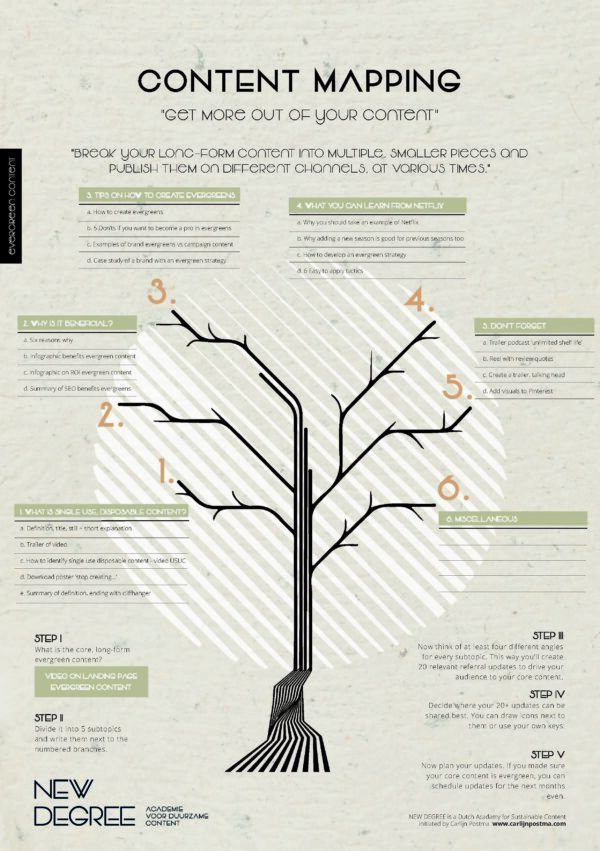 @CMIContent aracılığıyla @carlijnpostma, #İçerik eşleme, bilgileri tek bir kavram etrafında görsel olarak düzenlemenizi sağlar, diyor. Tweetlemek için tıklayınDeneyimli bir içerik eşleştiricisi, konuyu kolayca ayrı düşüncelere veya fikirlere ayırabilir. Ancak daha az deneyimli içerik haritacıları, haritayı fiziksel bir tezahür olarak kullanarak beyin fırtınası yapmalıdır. Bir ağaç çizmeyi ve dal olarak aklıma gelen tüm farklı kategorileri, konuları ve içerik türlerini not almayı seviyorum.