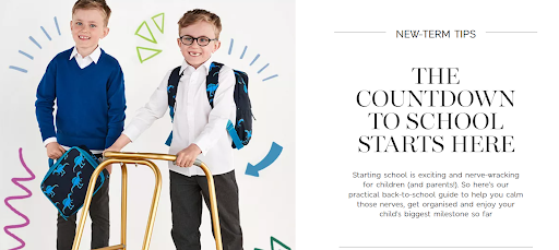 Marks & Spencer'ın okula dönüş rehberine hızlıca göz atarak içerik pazarlamanın nasıl yapıldığını tam olarak görün. İngiliz perakendeci, ortalama e-ticaret kataloğu sayfanıza razı olmadı. Bunun yerine, faydalı ipuçları ve ilgili ürünlere bağlantılarla dolu, "Yeni Dönem Kiti" ve "Stres Azaltan Üniforma" gibi tüketilmesi kolay kategoriler halinde düzenlenen özel bir okula dönüş web sayfası oluşturdular. İçerik pazarlamasının çalışması için karmaşık veya sofistike olması gerektiğini düşünme hatasına düşmeyin. Mevcut ürün sayfalarının akıllıca düzenlenmesi ve yeniden kullanılması, okula dönüş içerik pazarlamasını çocuk oyuncağı ve çok başarılı kılıyor!