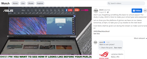 Tek lokmalık TikTok video formatı bir kazanan, ancak uzun formatlı video da öyle ve ASUS'un bu okula dönüş tanıtım videosu mükemmel bir örnek. Bir Facebook Live olarak sunulan, 2 saatten fazla sürüyor ve okul çalışmaları için harika bir dizi ASUS ürününü sergiliyor. Gösteri aynı anda diğer platformlarda da yayınlandı, ancak yalnızca Facebook'ta 16.000 görüntüleme topladı - süslü prodüksiyon değerlerine ve pahalı sahnelemeye dayanmayan bir video için fena değil. Sadece saf ürün ve eşantiyonlar ve ödüller kazanma fırsatı - her zaman bir çekiliş!