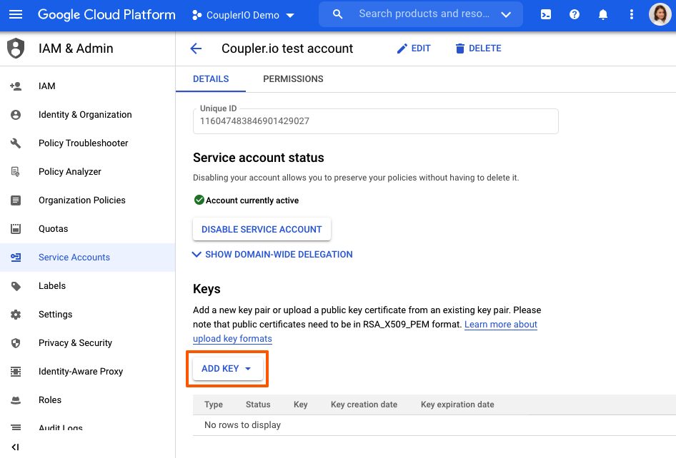 Hizmet hesapları listesinde, az önce oluşturduğunuz hesabı bulun ve açın. Aşağı kaydır. "Anahtarlar" bölümünün altında, "Anahtar ekle" ve "Yeni anahtar oluştur" seçeneğine basın.