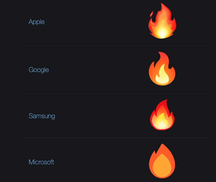 Örneğin, yangın emojisinin farklı platformlarda ve işletim sistemlerinde nasıl göründüğü aşağıda açıklanmıştır.