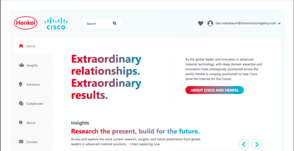 Ajans ortağı Transmission'ın yardımıyla Henkel, yalnızca Cisco.com e-posta adresine sahip olanların erişebileceği, kapılı, etkileşimli bir web deneyimi geliştirdi. Yapıştırıcı satıcısının, beyaz kağıtlar ve ayrıntılı ürün bilgileri dahil olmak üzere özelleştirilmiş, çözüm odaklı içerikle Cisco'nun etkileşimini izlemesini sağladı.