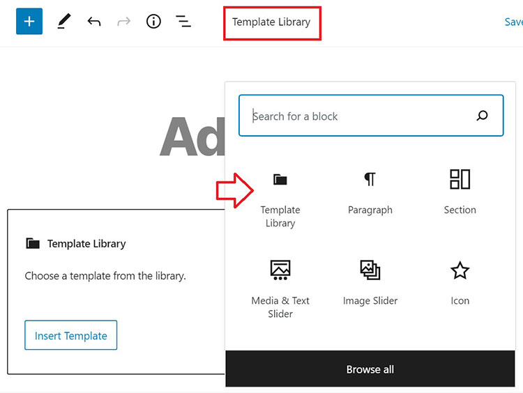 Şablon kitaplığı bloğunu kullanabilir veya bunlara erişmek için Şablon Kitaplığı düğmesini kullanabilirsiniz. İsterseniz tüm şablon kitaplığına göz atabilirsiniz. Belirli bir şablon içe aktarıldıktan sonra içeriği gerektiği gibi değiştirebilirsiniz.