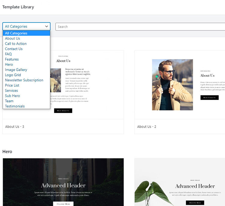 Şablonlar, ihtiyacınız olanı bulmanızı kolaylaştırmak için kategorilere göre uygun şekilde ayrılır. Kullanmayacağınız tasarımları kapatmak için Getwid ayarlar menüsünü kullanabilirsiniz.