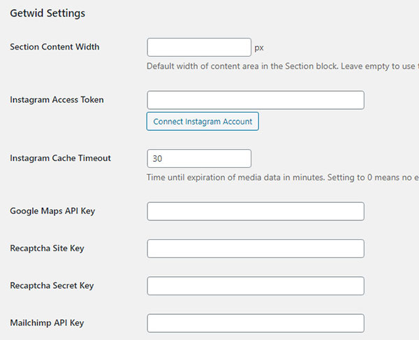 Instagram Erişim Simgesi, Google Haritalar API Anahtarı, Mailchimp API Anahtarı ve Recaptcha Site Anahtarı ekleme seçenekleri de vardır. Getwid'in blok kitaplığı MailChimp, Instagram ve Google Haritalar ile bağlantı kurar. Bu, ek eklentileri etkinleştirmek ve yüklemek zorunda kalmadan gerçekleştirilebilir.