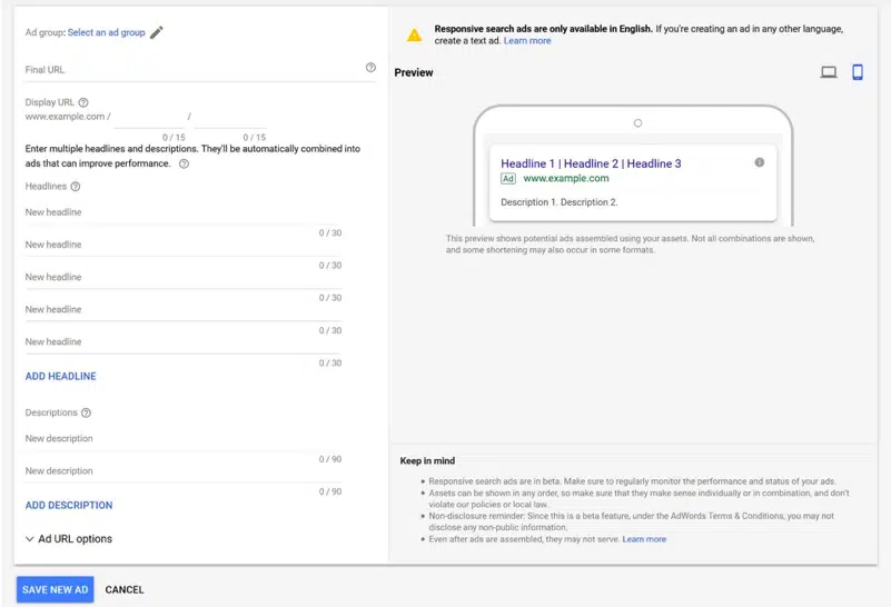 RSA'larla Google, reklamlarda hangi başlık ve açıklama kombinasyonunun görüneceğini ve ne sıklıkta görüneceğini belirler. Reklamverenler başlıkları ve açıklamaları sabitleyebilir, böylece 1, 2, 3 vb. konumlarda görünürler. Reklam grubu başına üç etkin duyarlı arama ağı reklamı sınırı vardır. Bu noktada Google, reklam grubu başına iki ETA ve bir RSA önermektedir.