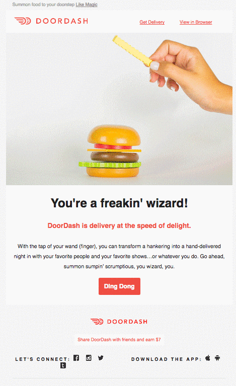 Doordash'ın e-postaları yaratıcı ve çok sayıda marka kişiliği sergiliyor olsa da, yeni ve mevcut müşterilerin özel promosyonlar alması ve yeni restoranlar keşfetmesi için harika bir kaynaktır.