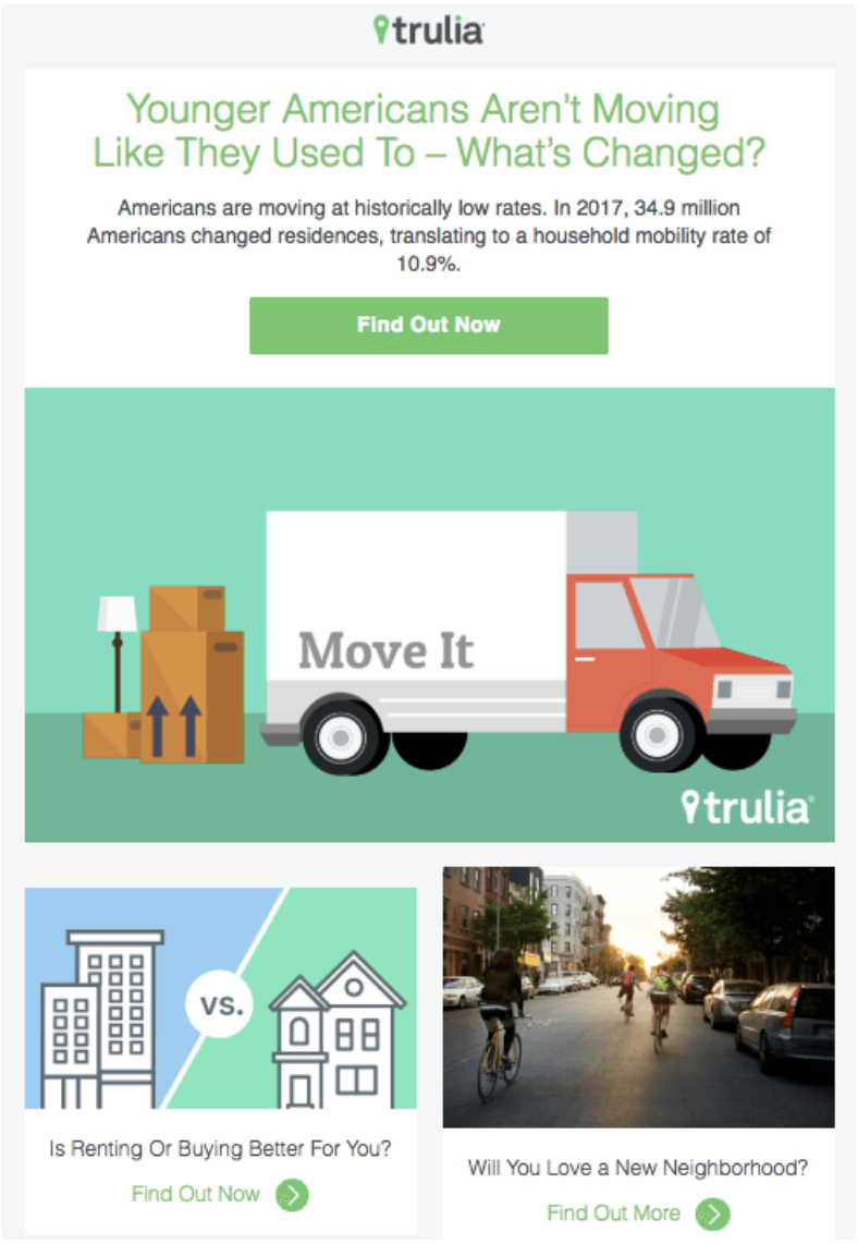 Trulia, potansiyel ev alıcılarına değerli bilgiler sağlamak ve kendilerini alanlarında bir düşünce lideri olarak konumlandırmak için e-posta pazarlamasını kullanır. Müşteriler mülk alıp satmak isterken Trulia, abonelerine emlak piyasasındaki uzmanlıklarını ve güvenilirliklerini göstermek için sektör trendlerini ve öngörülerini gönderiyor.