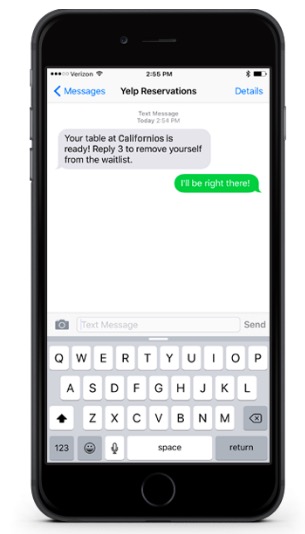 Yelp'in SMS programı aracılığıyla müşteriler, rezervasyonlarını yapmak, değiştirmek veya iptal etmek için restoranlara mesaj gönderebilir. İşletmeler, müşterilerini bekleme süreleri ve rezervasyon müsaitliği hakkında bilgilendirmek için metin uyarıları gönderebilir ve hatta müşterilerinin sorularına doğrudan yanıt verebilirler.